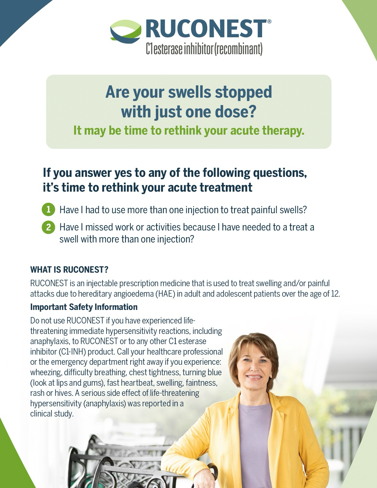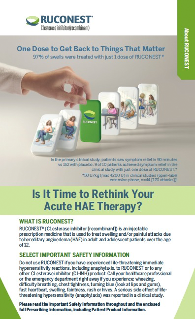 If you have any questions, our team of experts is available to provide assistance. Our priority is your well-being. Please call RUCONEST SOLUTIONS for more information at 1-855-613-4HAE (4423).